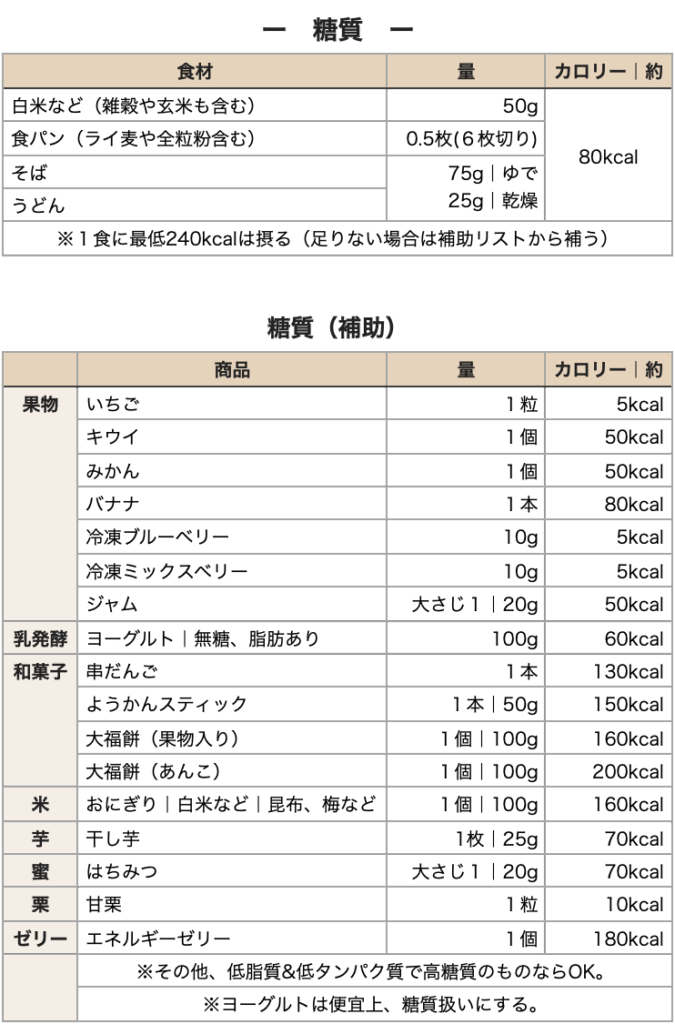 - 最低でも1食で240kcalは摂ります(糖質リスト参照)