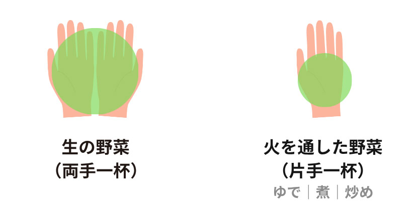 - 手のひらを使って1食に必要な野菜の量をざっくり測る方法です。