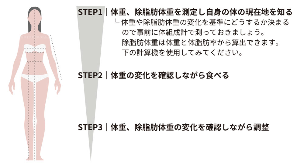 体重や除脂肪体重の変化を基準にどうするか決まるので、事前に体組成計で測っておきましょう。
