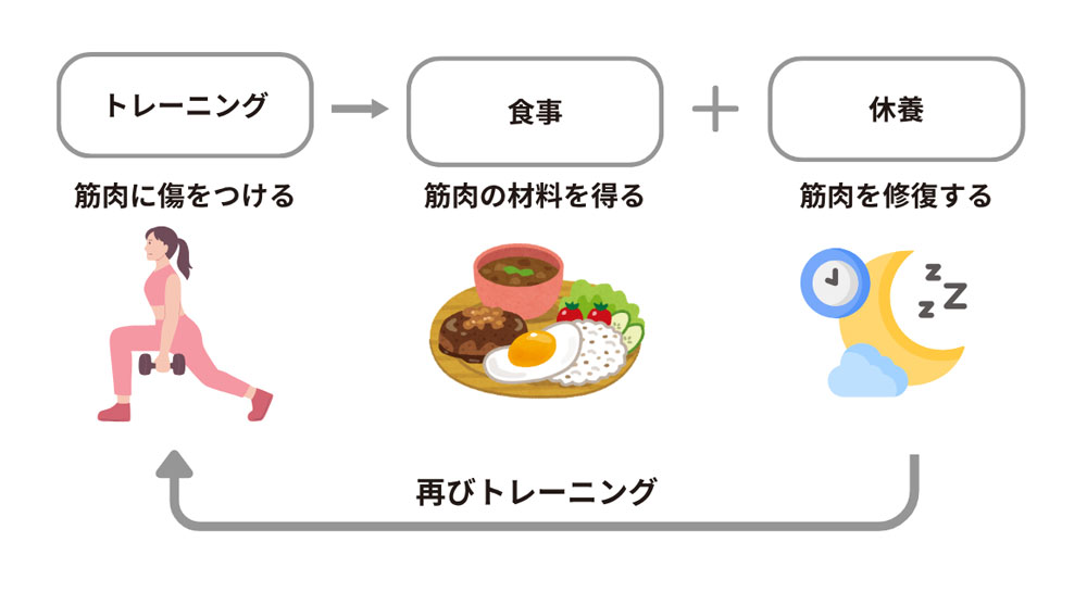 筋肉は、トレーニングで受けたダメージを修復する際、以前より太く強くなろうとする性質があります。 これを繰り返すことで、体は少しずつ変わっていきます。