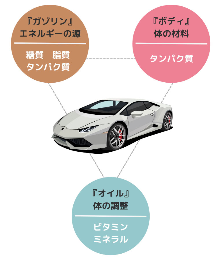 タンパク質からボディを作り、糖質、脂質、タンパク質からエネルギーを作り、ビタミン、ミネラルは体の潤滑油のような役割をします。車と同じように、これらが欠けてしまうと人の身体は悪くなってしまいます。そのためこれらの栄養素をしっかりと摂るようにしましょう。